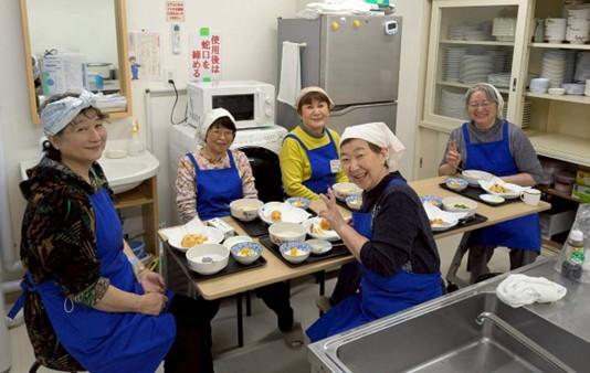 45人分の食事を作ってくれた調理スタッフの皆さん。いつもおいしいくてバランスの良い食事をありがとうございます。厨房はホールから見えませんが、陰で支えて頑張ってくださっています。