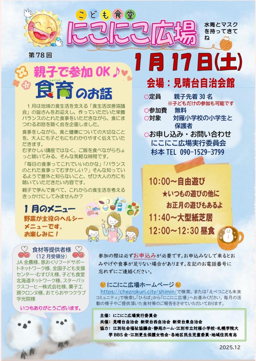 1月開催のお知らせ 投稿日時 : 2025/12/26 にこにこスタッフ ▷水筒とマスクを持たせてください。 ▷お申込み・お問い合わせ 杉本 090-1529-3799 ※提供する食品はアレルギー対応をしておりません。ご了承ください。
