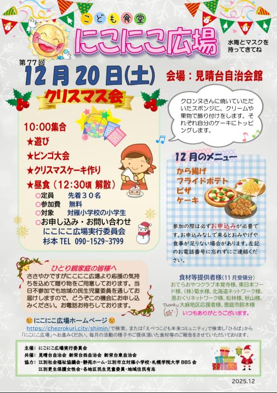 12月開催のお知らせ 投稿日時 : 13:36 にこにこスタッフ ▷水筒とマスクを持たせてください。 ▷お申込み・お問い合わせ 杉本 090-1529-3799 ※提供する食品はアレルギー対応をしておりません。ご了承ください。