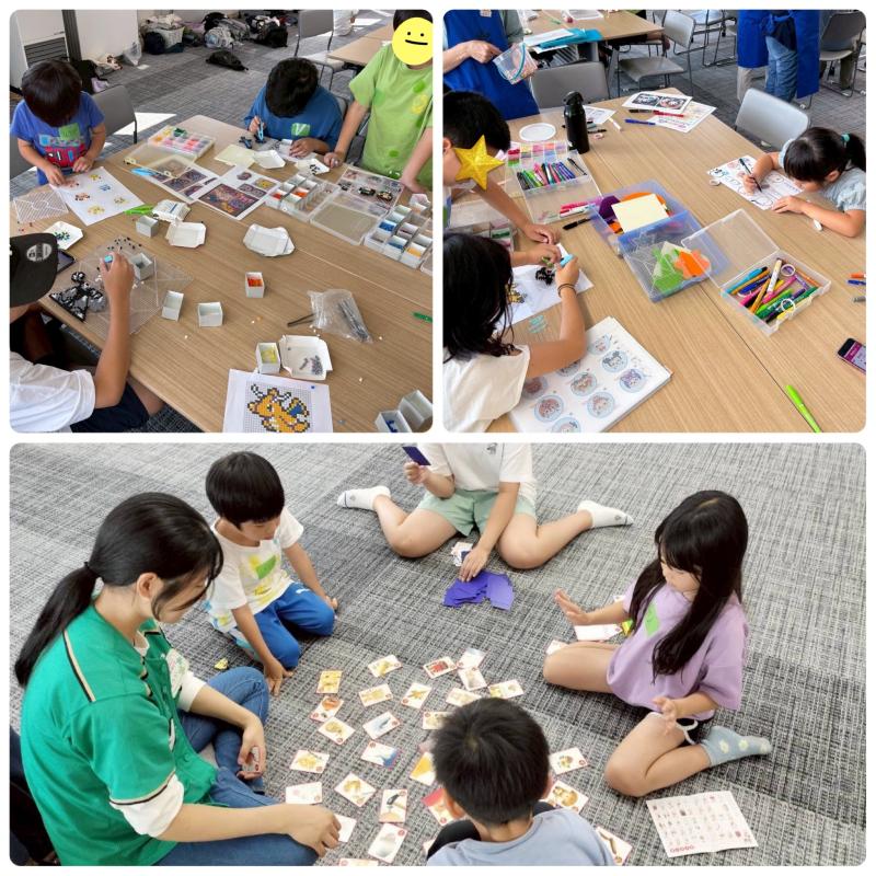 プラ板、アイロンビーズ、かるたや、大広間のカーペットの上で身体をうごかしたり・・・。