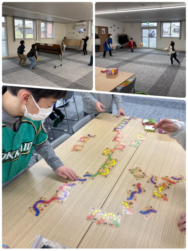 大広間の前半分はテーブルを並べて、プラバンや折り紙などの制作やアナログゲーム、後半分ではビーチバレー。子どもたちは、お友だちやスタッフと好きな遊びを楽しみました。