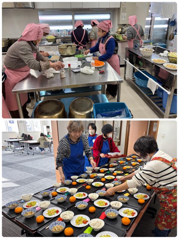 子どもたちが遊んでいる裏では、調理場で「食生活改善協議会」の皆さまが調理中。