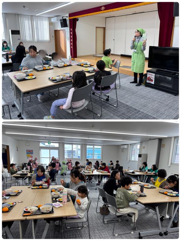 いただきますの前に江別市保健センターの小野寺さんから、リーフレット「健康のために野菜を食べよう!1日の目標は350g」を配布して頂き、食事と野菜についてのお話。