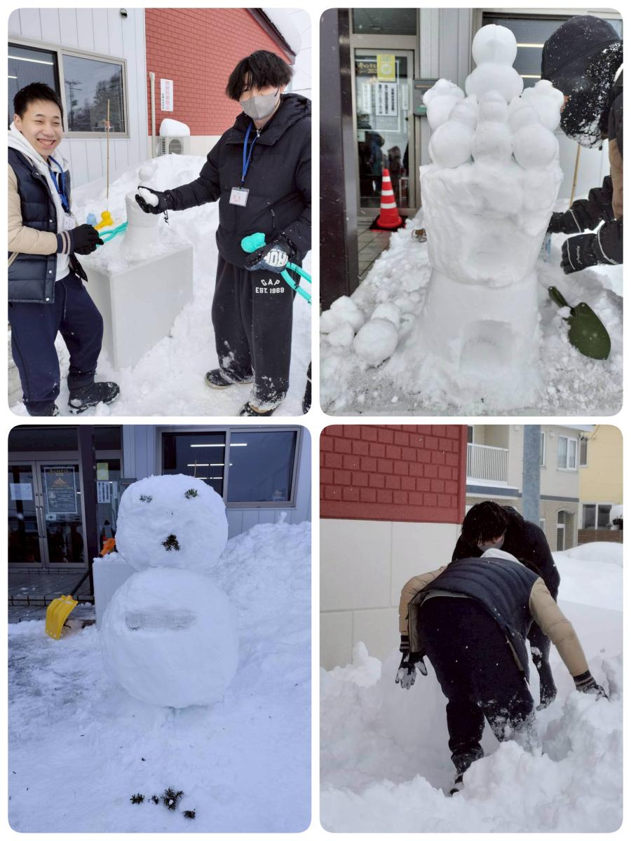 ジモ×ガクの学生さんが力を合わせて、ドーンと大きな雪だるまを作ってくれました!バッチリ玄関前に設置しました。