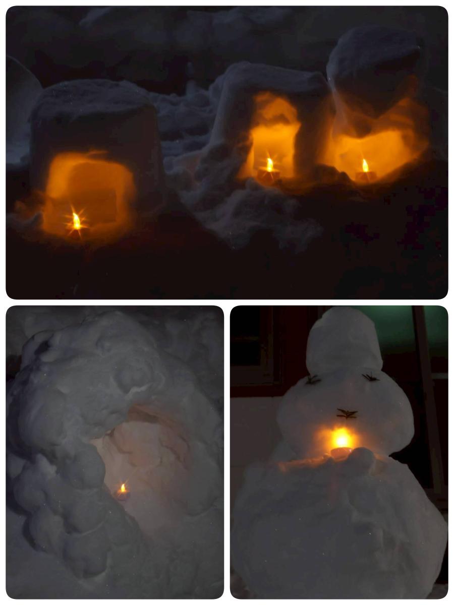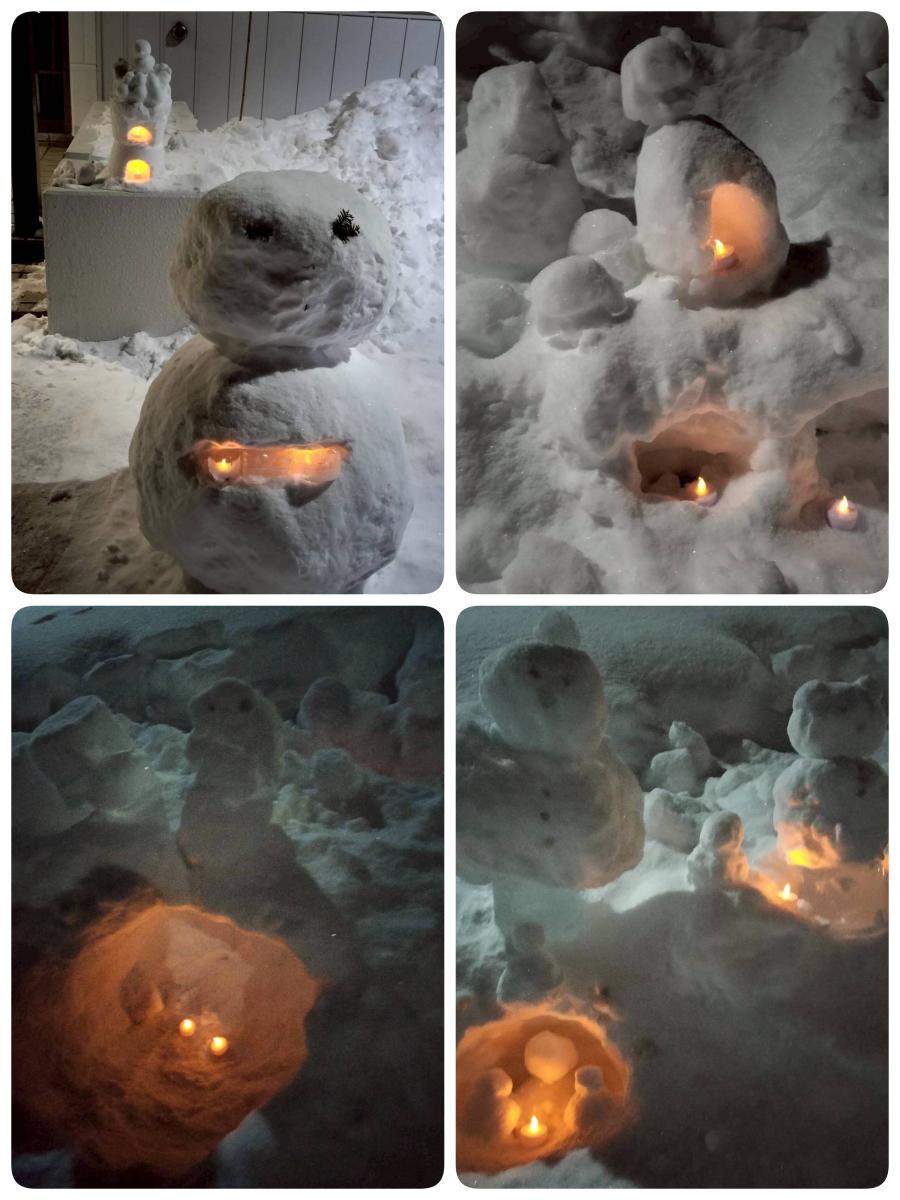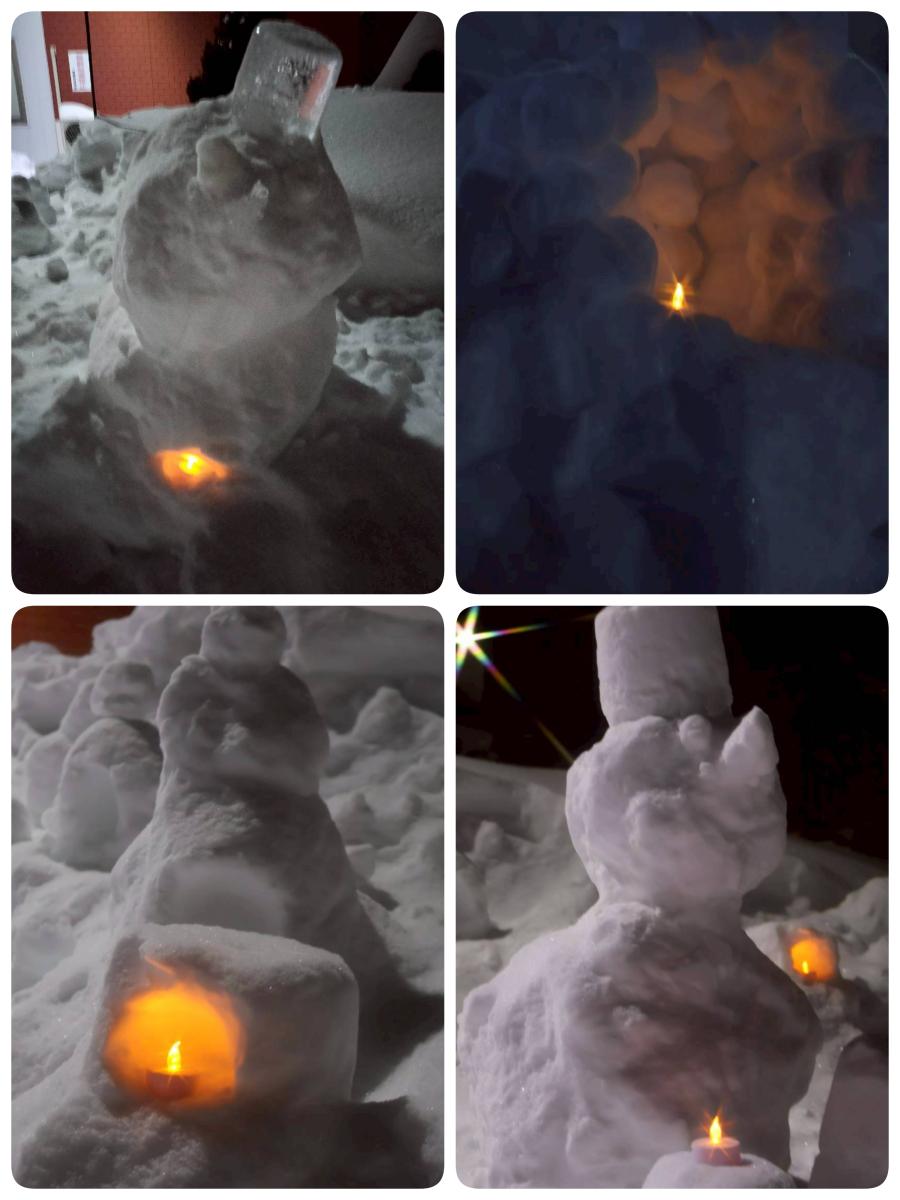 今回は見晴台自治会が開催するキャンドルナイトににこにこ広場も参加させていただき、自治会館前に雪だるまやスノーキャンドルを作りました。