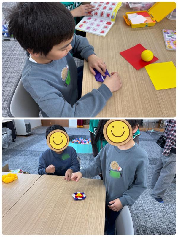 折り紙で上手にコマを作りました。クルクルよく回ります。