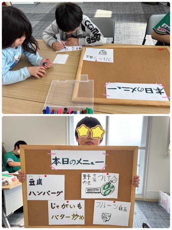 2年生の男の子がメニュー表を書いてくれました。野菜の「菜」はまだ学校で習ってないけれど、見本を見ながら「野菜のつけ合わせ」、「フルーツ白玉」をイラスト入りで上手に書いてくれました。ありがとう!