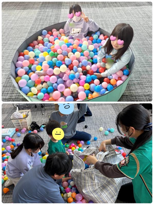 ガチャガチャやカードゲーム「ハンズ」。プールいっぱいのボールに埋もれたり。最後は散らばったボールを全力でお片付け!