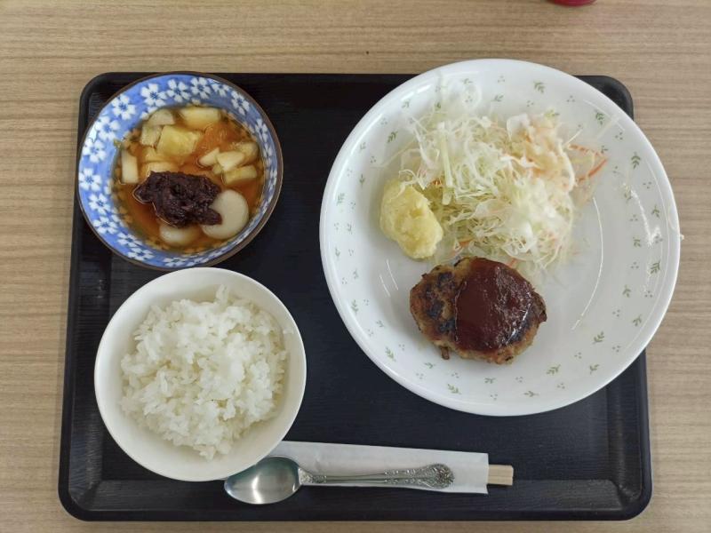 豆腐ハンバーグ、野菜のつけあわせ、じゃがいもバター炒め、フルーツ白玉